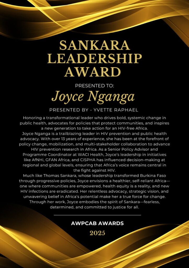 We are proud to celebrate Joyce Nganga, Senior Policy Advisor at WACI Health, for receiving the Sankara Leadership Award at the African Women Prevention Community Accountability Board (AWPCAB) Awards 2025.